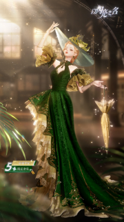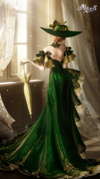 灵感源自套装灵感源自20世纪初欧式宫廷服饰,整体以雍容华贵的墨绿色为主色调,大面积采用精细暗色光泽提花织就,繁复的金线勾边裙摆花纹。整体设计凸显出一位高贵优雅的伯爵夫人形象;