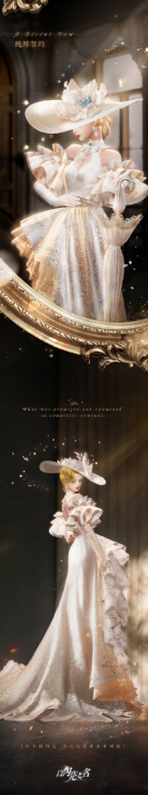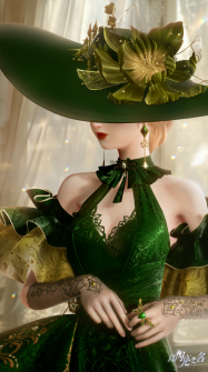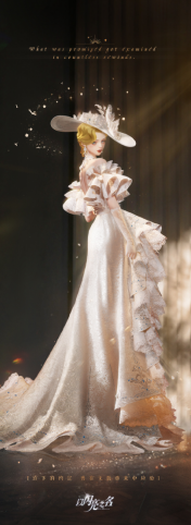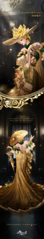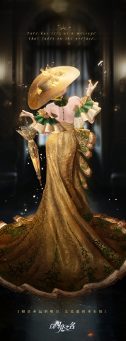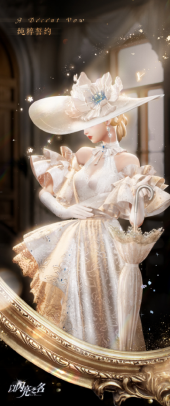 技术呈现整体套装从多出细节体现复古与创新,裙摆处的不对称剪裁和蕾丝的环绕堆叠,极致展现优雅贵妇气质,挂脖细带与夸张层叠袖子的搭配,更加凸显身材曲线。手持的雨伞会有环绕转动的花朵和粒子特效,礼帽上的超大花朵的设计,蜻蜓围绕着礼帽转动其中,并适时的落在花蕊之上,飞行轨迹也带有粒子特效,更具华丽气息;