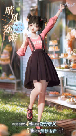 累积郊游积分,可以获取限定四星套装踏野晴风、拍照萌拍兔兔去野餐、潮流色卡13、华绽邀请函及多种材料道具!在活动最后三天,我们还会每日奉上纪念礼包,包括限定五星耳饰清铃击音、拍照相框多巴胺女孩、钻石30、潮流色卡*9及多种材料道具,千万不要错过!