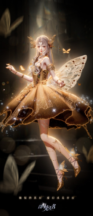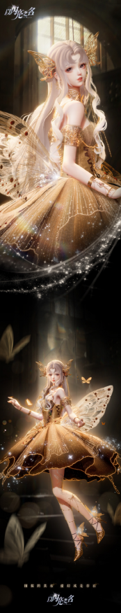 技术呈现整体套装多出细节体现童话般幻想的氛围。胸口蝴蝶的翅膀会随着人物轻柔的挥动,栩栩如生。华丽的高跟鞋绑带后蝴蝶翅膀带有飘散粒子特效,散发迷人气质。裙摆跟随人物浮动向下坠落粒子光晕特效,高亮的蝴蝶闪于其中,增加主题气息,裙摆也如真实的蝶翼一样律动,带来独特的呼吸感,赋予套装全新的生命;