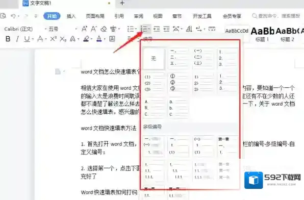 1. 在wps上打开word文档,选中需要填充的部分,找到菜单栏的编号,并点击多级编号,并进入自定义编号。