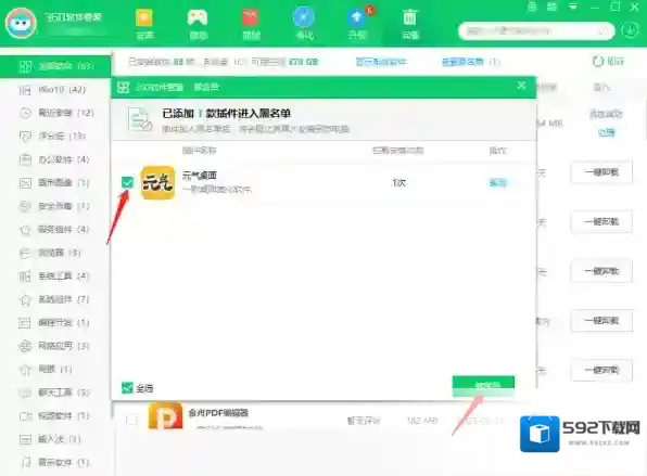 进入360软件管家黑名单界面后,勾选需要移除的软件,点击下方一键移除即可将软件从黑名单中移除。