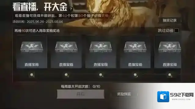 观看直播可获得开箱钥匙,有概率获得金狮雕像等高价值奖励!第40个和第80个箱子必得大金!