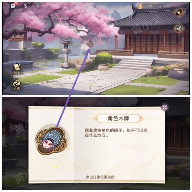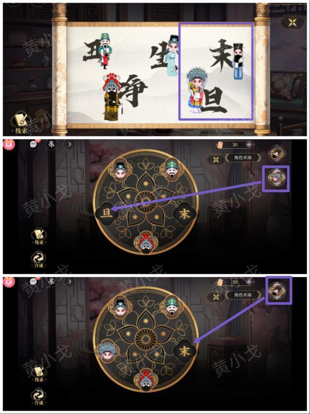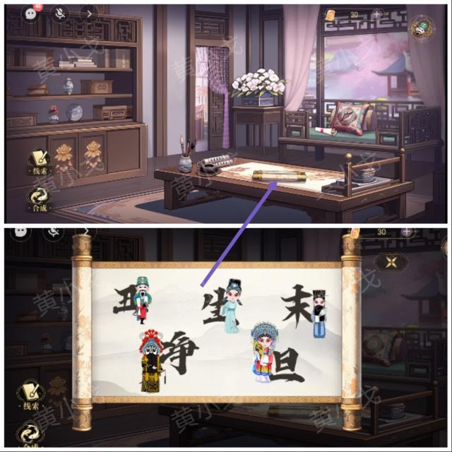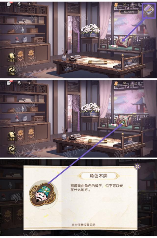 14.点击梳妆台抽屉上的密码锁,根据槽位上的文字,结合[书房]书桌上的卷轴上的线索,把三个角色木牌放入正确的凹槽中