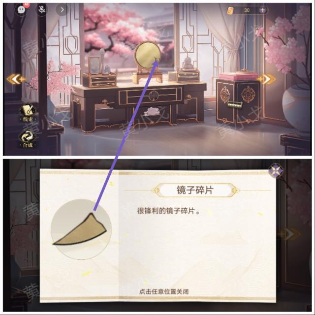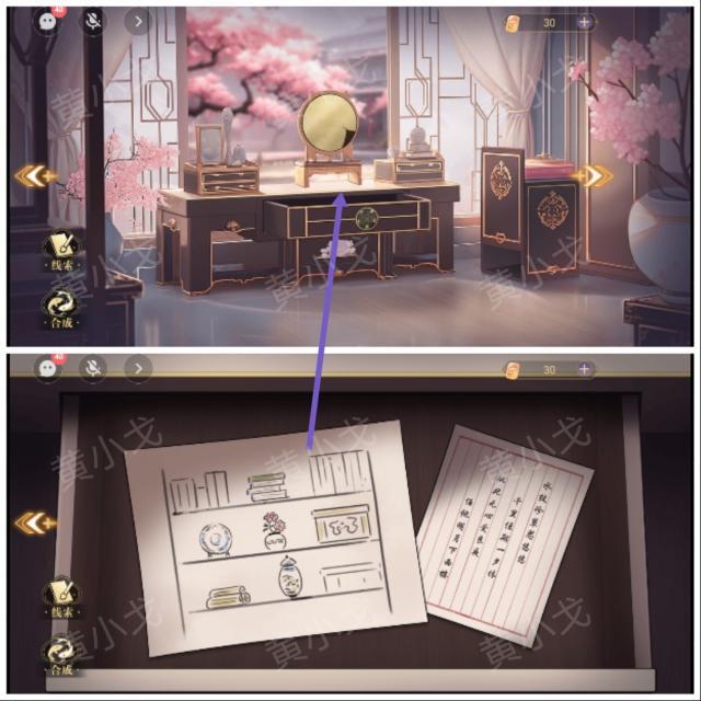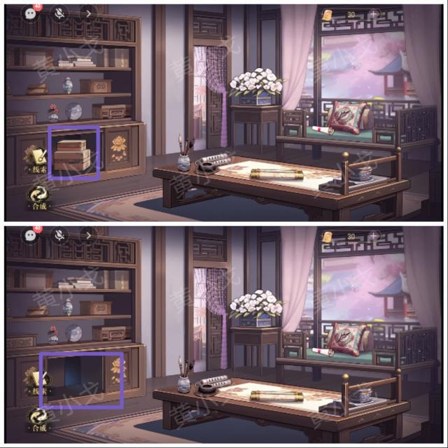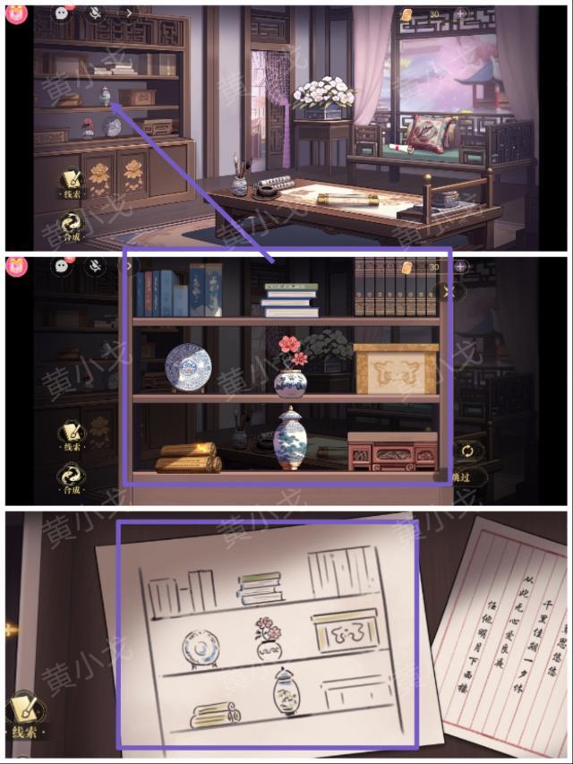 16.点击书柜,根据[闺房]梳妆台抽屉里的纸张内容,正确摆放物品的位置