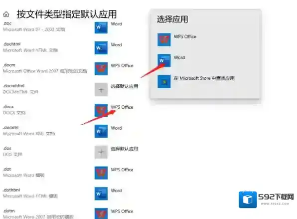 3、在弹出来的页面中找到需要修改的格式类型,点击后面的默认应用,选择office对应的软件图标即可。