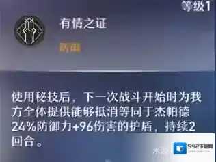 战斗开始为我方提供等同于杰帕德24%防御力+96伤害的护盾,持续2回合