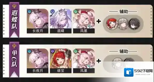 对于1+0缇宝来说,当前版本配队必然是“蝶风缇月”;而对于0+0缇宝来说,可以根据上下路配队情况灵活选择”蝶风月+辅助”的组合:辅助位上的”缇阮记”之外,也可以考虑 赛飞儿/银狼 这类泛用虚无角色。