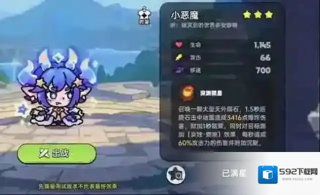 缺点:同剑客和女巫一样,十分依赖火属性装备,同时大招的CD长,释放前摇较长,不容易击中对面,小恶魔作为输出角色,自身坦度较低,也是害怕贴脸角色直接贴脸。