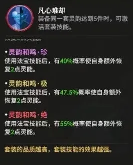 这里重点说一下九头虫搭配凡心难却,因为本阵容为5保1的单核输出体系,所以对于这唯一的一个输出就必须有较高的输出要求。而九头虫本身就可以通过天赋回能,再携带凡心难却后灵技的施放频率进一步加强,基本上可以做到每回合都能施放灵技。