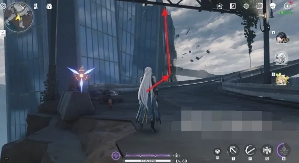 2、之后从传送锚点出发,沿着空中漂浮的公路往前走到下图箭头位置;