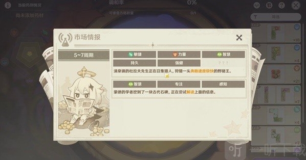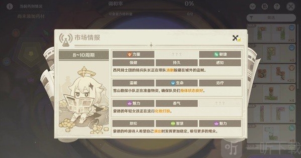 本阶段的市场情报所需药剂的倾向与词条如图所示。这一阶段中,存在四个市场情报(如图所示),随机生效其中两个!看自己是哪两个情报!