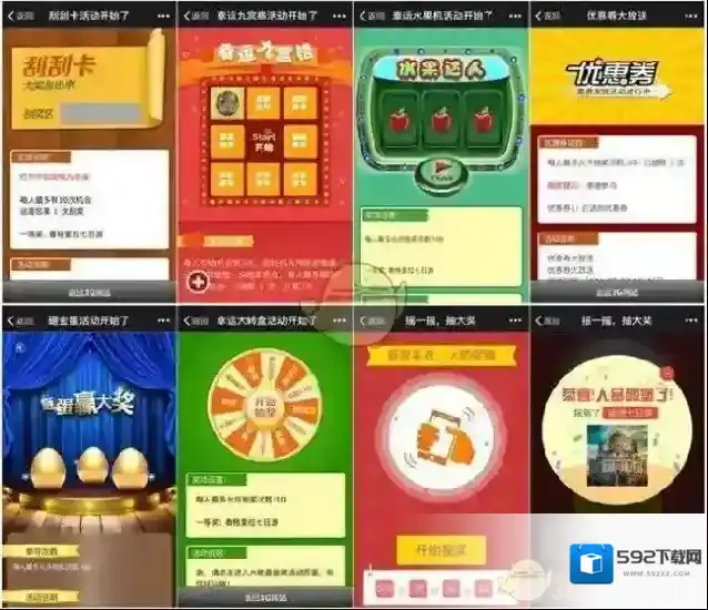1. 抽奖类应用:微享宝抽奖类营销应用相当丰富,比如摇一摇抽奖,砸金蛋、九宫格、水果机、大转盘、刮刮卡、优惠券。商家可在后台设置好奖品等活动信息与细节设置,比如抽奖次数、中奖次数等。粉丝进入活动后根据指示抽取商家送出的劳动节大礼。