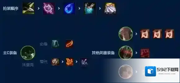 狼人的三件装备是必备的,同时狼人启动速度不够需要棋子来补充,瑟提旗子越多越好,劫作为副C偷偷就是最好的装备