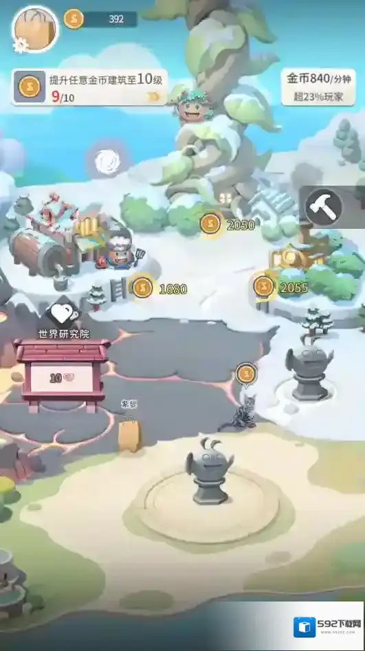 新手任务很简单,和炼金坊一样就是捡金币,有小猫出现点击它会掉落大量金币哦。点击右边的锤子可以升级建筑。升级建筑需要的金币是递增的,建议平均升级。