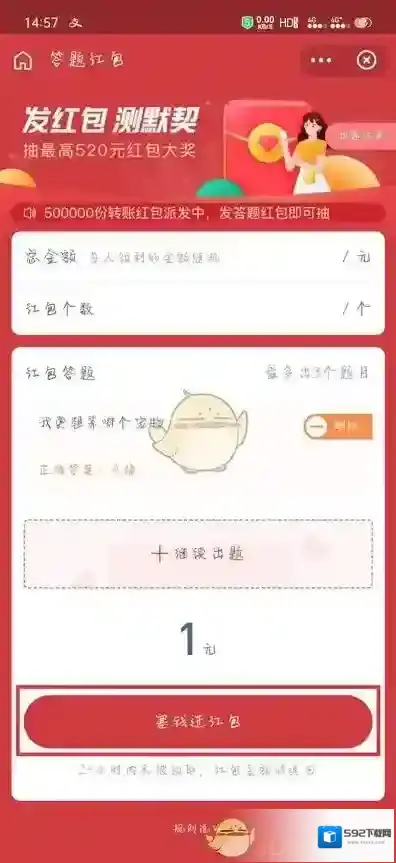3、跳转到答答星球之后,输入红包的总金额、数量,然后点击点击出题,测默契;