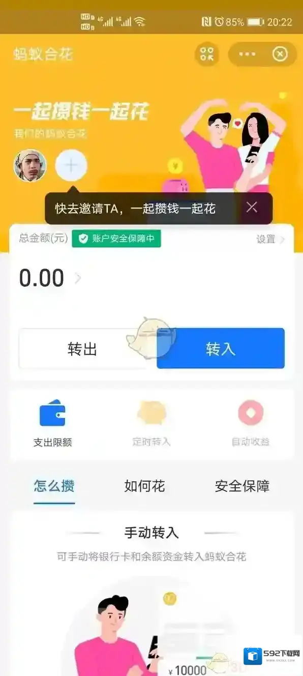 4、当双方都加入蚂蚁合花后,可将自己银行卡或余额宝中的钱手动转入,这样在线下支付,或是淘宝天猫购物的时候,就可以选择用“蚂蚁合花”支付了。