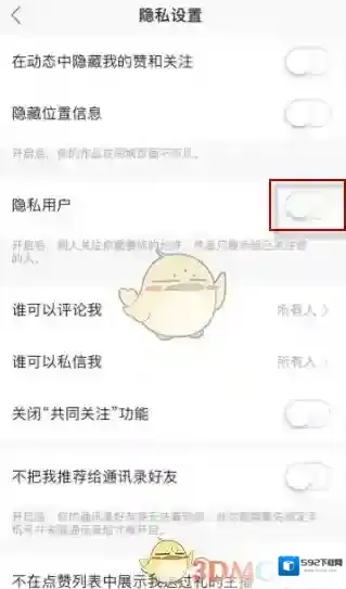 4、进入隐私设置界面,开启“隐私用户”即可。