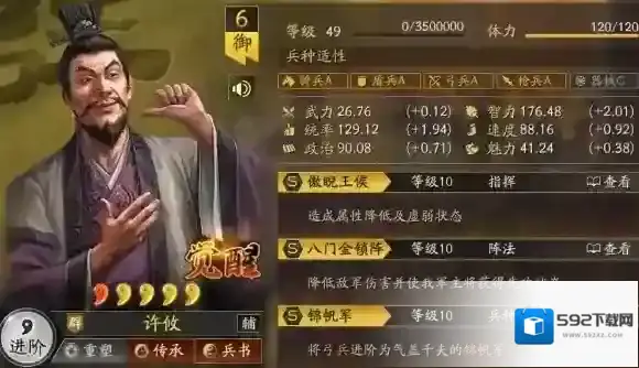 许攸:锦帆军+八门金锁阵;严阵以待+守势+防备,老许既是降维高手,也是防御辅助核心,减伤防守类的兵书最为妥贴。