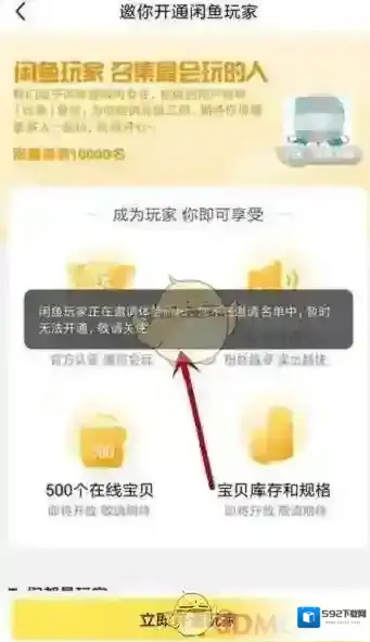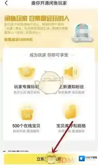 5、进入到闲鱼玩家后,可看到目前只有10000人可以体验到闲鱼玩家的功能,点击下方的立即开通玩家。
