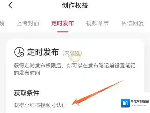 5、在这里就可以看到,要解锁定时发布功能需要先通过获得小红书视频号认证。