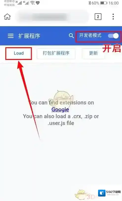4、之后就会进入到扩展程序界面了,我们需要先将右侧“开发者模式”开关打开,然后点击下方的”load”选项。