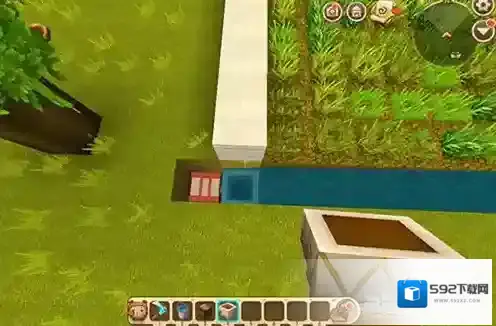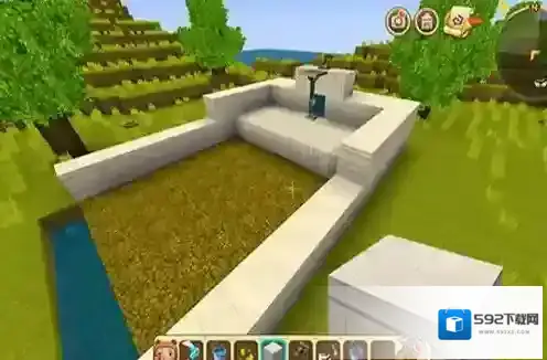 首先我们先开垦出一片7乘7的农田,在左侧开出一条壕沟,壕沟最里边放上一桶水,然后在右侧中间开个洞,放入一桶水,这样整片农田的水需求就满足了。