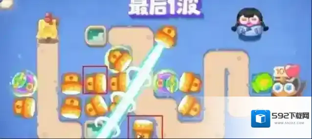 5、第五波左侧加一手电筒升满级,再加一手电筒升一级,这时候道具全清了哦!左侧加一泡泡塔升一级。