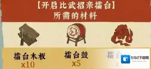 5、来到放置在城镇中的“招亲擂台”并点击,接着将修复所需的材料“擂台木板*10”、“擂台鼓*5”、“擂台彩带*10”进行提交,就能完成翻新修复,这样就可以在城镇中开启比武招亲。