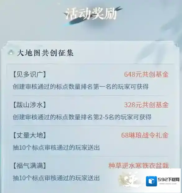 在江湖指引中,您还可以自定义自己的玩法偏好,不管是更喜欢PVE、PVP还是PVX休闲玩法,都会有明确的指引,奖励都能嘎嘎拿满!大地图标点活动来袭共创江湖,海量基金、周边等你拿!这是为了避免官方过早“剧透”,同时也顺势邀请广大同门“共创江湖”!即日起至7月20日,我们将开启“大地图共创征集”活动。您遇到的奇遇见闻、收集到的宝箱风物,都可以标注在大地图,留下您的痕迹。官方会审核玩家标点的准确性,并根据游戏开放的进度,按照一定节奏适当放出标点内容。参与地图共创活动,即有机会获得648共创基金、种草逆水寒铁衣盆栽等精美礼品!