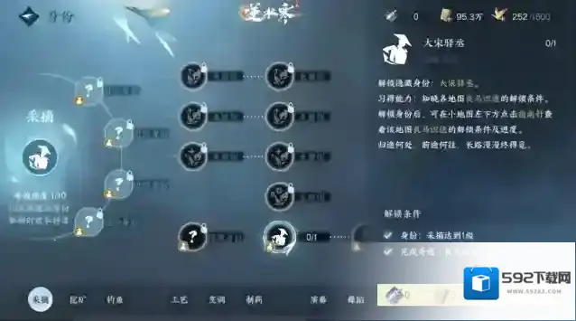 完成奇遇以后我们打开菜单-身份-采摘-技艺页面在右下角可以看到大宋驿丞的隐藏身份,点击并升级该身份。
