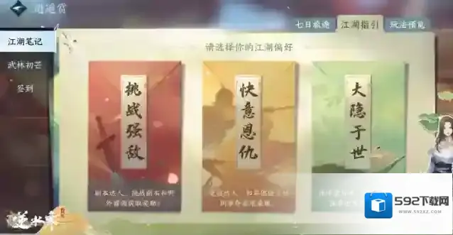 江湖笔记自定义您的江湖玩法偏好如果您还是觉得太自由、没有目标感、不知道应该做什么,只要打开主界面顶部逍遥赏,打开江湖笔记,跟着七日旅途或者江湖指引做就可以了!