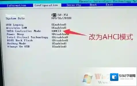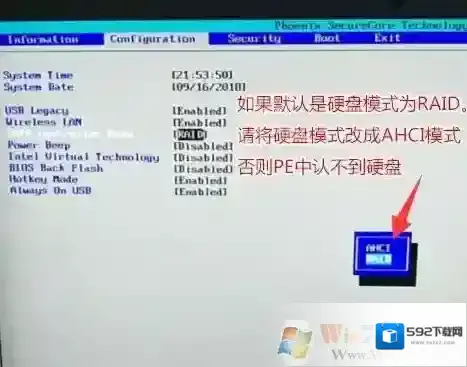 6、注意:再返回configuration这项,查看sata controller mode这项,如果默认硬盘模式为RAID,请将硬盘模式改为AHCI模式,否则进PE后不能认出硬盘,如果更改后记得按F10保存,如下图所示;