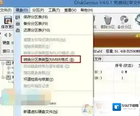 转GPT分区为MBR格式:删除分区后,装换硬盘分区表类型 为 MBR 格式,同样还是从“硬盘”–“转换分区表类型为MBR格式”,然后保存更改(以下为图示,此时该项为可点,如不可点说明已经转换好了。),如图: