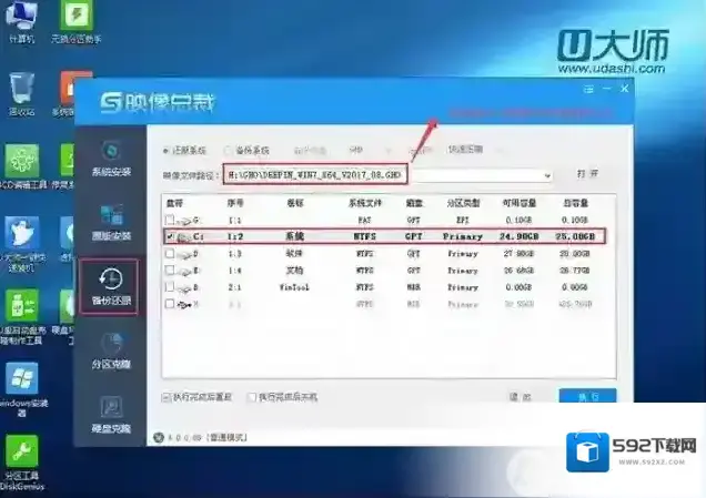 第四步:安装GHOST WIN7系统1、打开SGI映像总裁)在之前拷贝到U盘GHO文件夹中,打开后选择“备份还原”选项,然后点击执行。