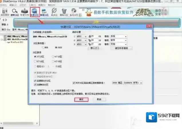 4、这时我们再点“硬盘”-“快速分区”,默认会创建ESP分区和MSR分区,选择分区数目,确定。
