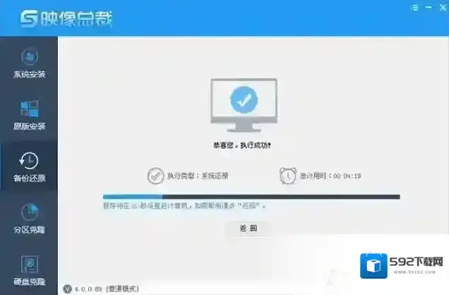 4、还原分区结束后,“自动倒计时10秒重启“或选择“返回”不重启。