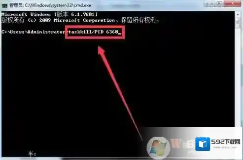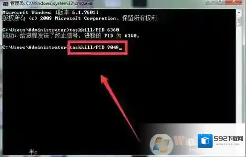 6、首先,按要求输入Taskkill/PID命令字符,然后再输入之前要关闭的进程的PID数字,输入后按回车键确定。