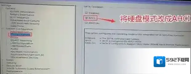 5、注意:切换到system configuration项,如果硬盘模式是raid,将sata operatior硬盘模式改为ahci模式,否则安装win7会同现0x0000007b蓝屏,改了后选择退出并保存BIOS,如下图所示;