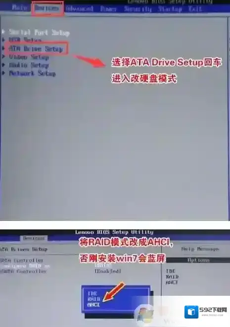 4、切将键盘移动Devices选项,把键盘移动ATA Drive Setup回车,将configure SATA as中默认的raid改成ahci模式,否则安装win7时会出现0x0000007b蓝屏,因为win7中没有集成raid硬盘驱动,然后选择F10保存设置,在弹出的选项中选择YES,如下图所示;