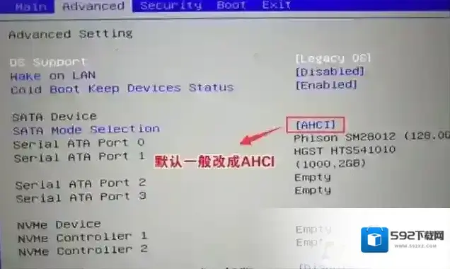 4、再将移动上下方向键,移动到Advanced中将SATA Mode Selection选项的启动项更改为AHCI,否则安装WIN7会出现0x00007b蓝屏,如下图所示,然后再F4保存设置;