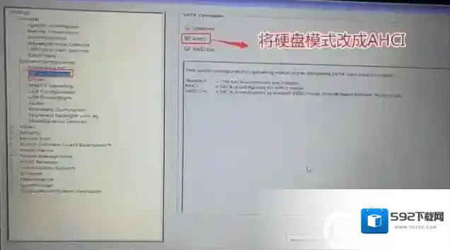 4、注意:切换到system configuration项,如果硬盘模式是raid,将sata operatior硬盘模式改为ahci模式,否则有些U盘进入PE后找不到硬盘,改了后选择退出并保存BIOS,如下图所示;