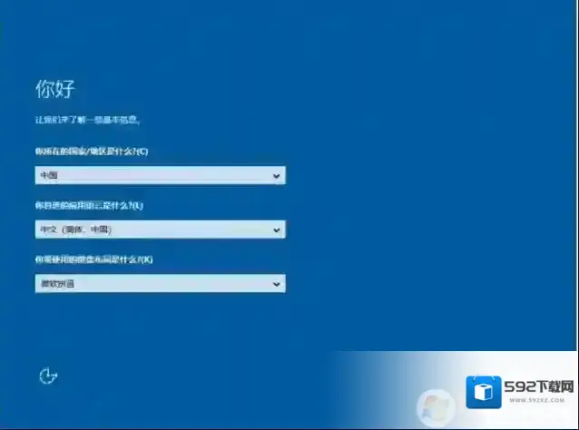 10、重启之后开始配置过程,我匀选择语言、地区,键盘布局等信息;