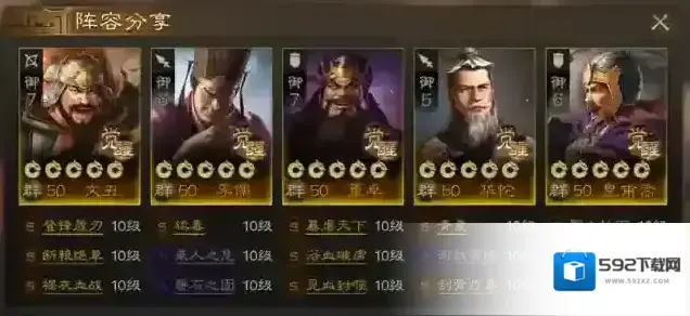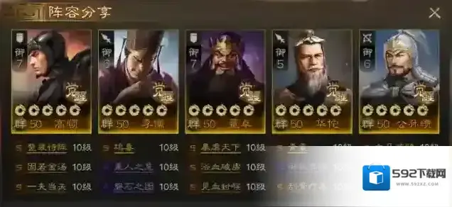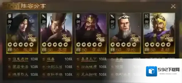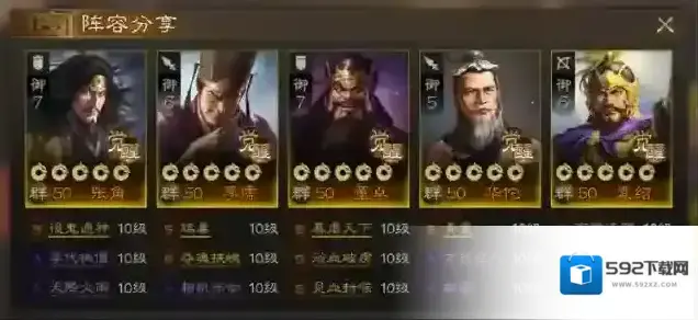 这个阵容的关键在于 董卓、李儒 的毒伤害,还有华佗的群体强力治疗提供续航,其他武将是可以替换的。