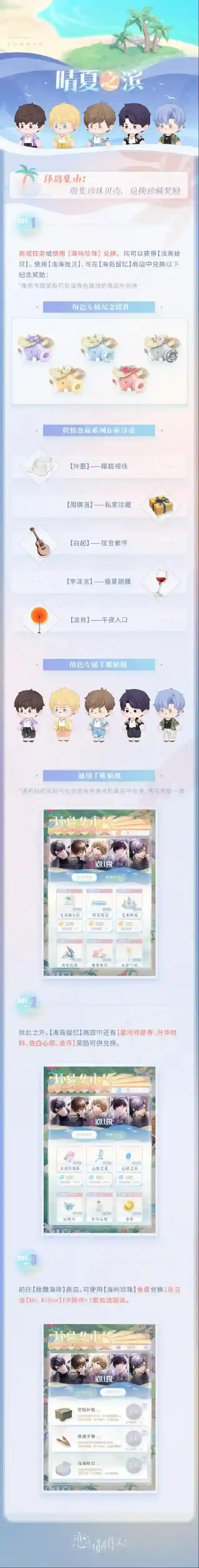 情动升腾海浪,停泊于你的心港和他一起建设海岛、经营店铺,免费领取夏日纪念R羁绊、炽情恋旅系列在你身边、纪念头像框、手账贴纸等多重好礼!活动时间:7月4日更新后~7月15日23:59初访小岛:建设店铺 景观,提升海岛星级和心仪的他前往小岛,建设五种店铺,获取海屿珍珠奖励!为小岛布置景观装饰,还能提升海岛星级哦~店铺开张:通关小游戏,体验模拟经营调制饮品、限时上菜、收网捕鱼……和他一起完成特殊订单,攀上营业额新高峰!探索小岛:触发互动剧情,拾取收集品活动期间,可随时与他互动,不同工作状态和职位的他会给你不同的反馈。进一步探索小岛,还能拾取海岛收集品和专属于他的收集品。建岛经历:查看游客评价,回顾岛上剧情活动期间,可随时在查看信息查看游客评价、过往剧情和店铺经营情况。点击查看信息旁边的椰树按钮,还可以查看收集品图鉴。小岛蓝图:完成任务,领取纪念羁绊活动期间,完成指定任务,即可领取纪念头像框浅海沁甜、分段称号默契满分的海岛富翁和浅海拾贝奖励。完成角色路线的全部主线剧情,即可领取该角色的夏日纪念R羁绊!BGM上架情报7月4日更新后,活动主题BGM《晴夏之滨》同步永久上架去见他,制作人使用时光解锁券*98即可解锁环岛集市:收集珍珠贝壳,兑换珍藏奖励1.完成任务或使用海屿珍珠兑换,均可获得浅海拾贝奖励。2.使用浅海拾贝,可在海岛留忆商店兑换纪念摆件、炽情恋旅系列在你身边、手账贴纸和星河许愿券、升华材料、告白心愿、金币奖励。3.使用海屿珍珠,可在微醺海岸商店免费兑换1张Mr. Killer自选ER羁绊+1套自选服装!*Mr. Killer活动兑换界面将开放至7月17日23:59