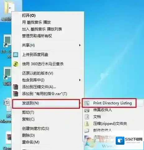 完成以上操作后,现在想要打印一个文件夹的目录只需右键点击,然后选择“发送到”,再选择“打印目录列表”立即搞定!