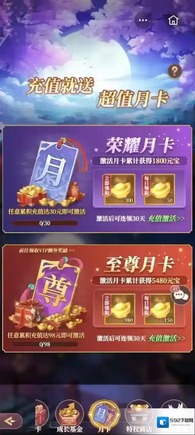 无需购买,充值30元立即送。当月每天送元宝,天天可领取!