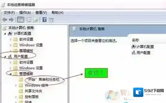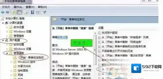 6、在“组策略编辑器”窗口左下方展开“管理模板”-单击“开始菜单和任务栏”-在窗口右边找到并双击打开“从开始菜单中删除“运行”菜单”项目;