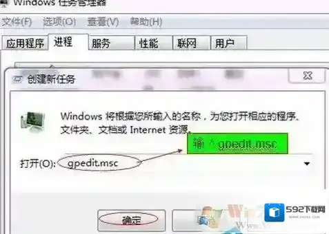 5、如果打了勾问题还是没解决,同时按下Ctrl+Alt+Del键打开“任务管理器”–在“任务管理器”中点击“文件(F)”-单击“新建任务(运行。。。)”-弹出的“创建新任务”中输入“gpedit.msc”,点击确定-在打开的“组策略”