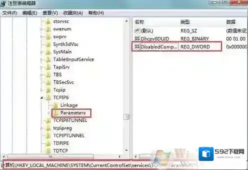 2、依次打开:HKEY_LOCAL_MACHINESYSTEMCurrentControlSetServicesTcpip6Parameters,然后右键新建DWORD(32-位)值,命 名为DisabledComponents,如图所示: